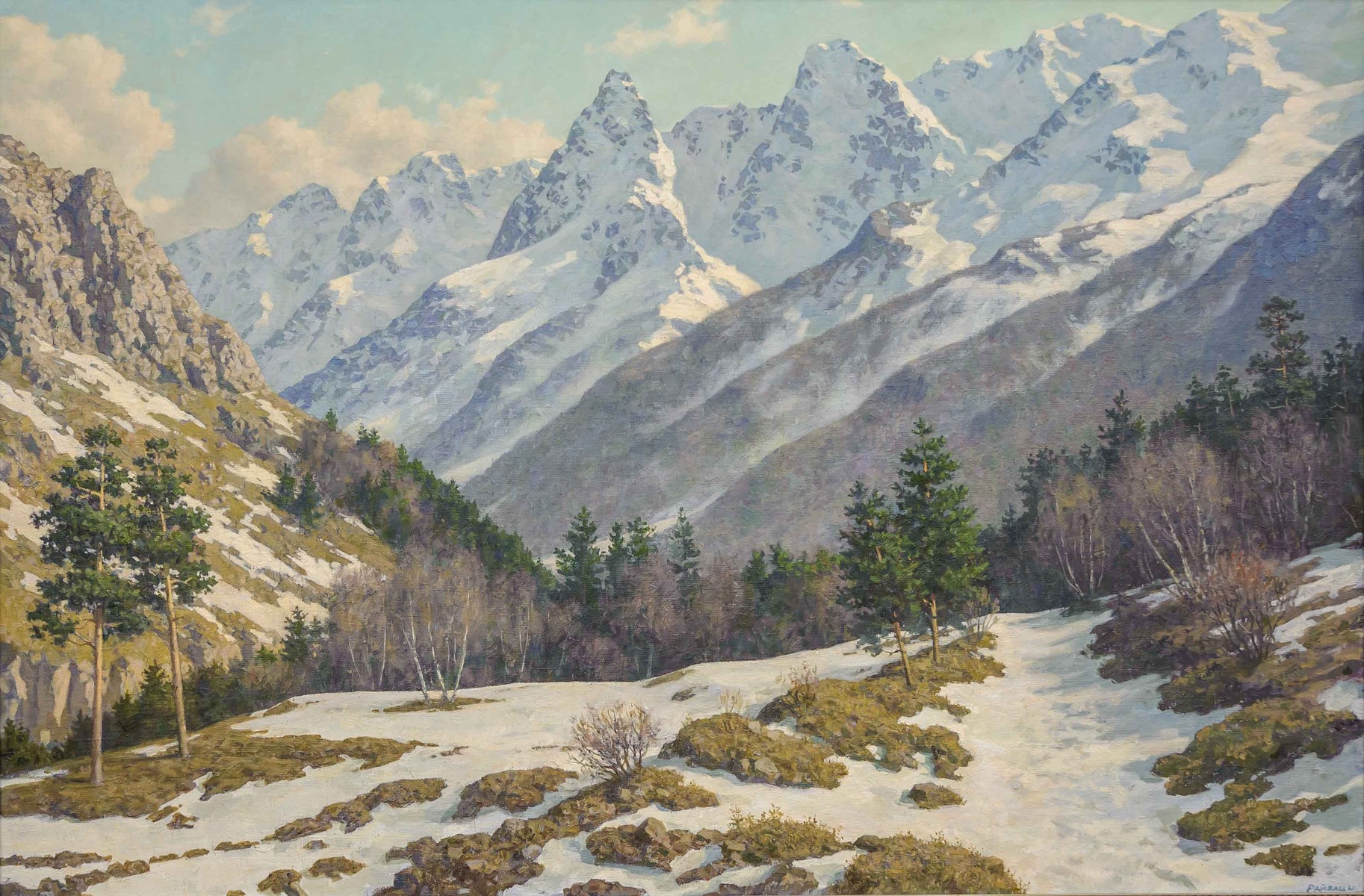 Любимый сюжет в творчестве Николая Райбаца: это Баксанское ущелье в Приэльбрусье – самое знаменитое и живописное в Центральном Кавказе. Это и место рождения, и творческая Родина. Райбац родился в самом высокогорном городе Российской Федерации – Тырныаузе Кабардино- Балкарии, куда вернулся после окончания Краснодарского художественного училища и жил до 1985 года. У художника богатое спортивное прошлое – альпинизм и скалолазание, так что горы он знает лучше многих других, знает душу гор, изменчивую и суровую. Райбац создает эпические пейзажи-картины, в которых передает не свой минутный восторг, как это делают многие другие, а запечатлевает время, которое равно вечности. Для художника Эльбрус - это как для любого японца гора Фудзияма, к которой любой житель Страны Восходящего солнца приходит хотя бы раз в жизни, чтобы поклониться ей.