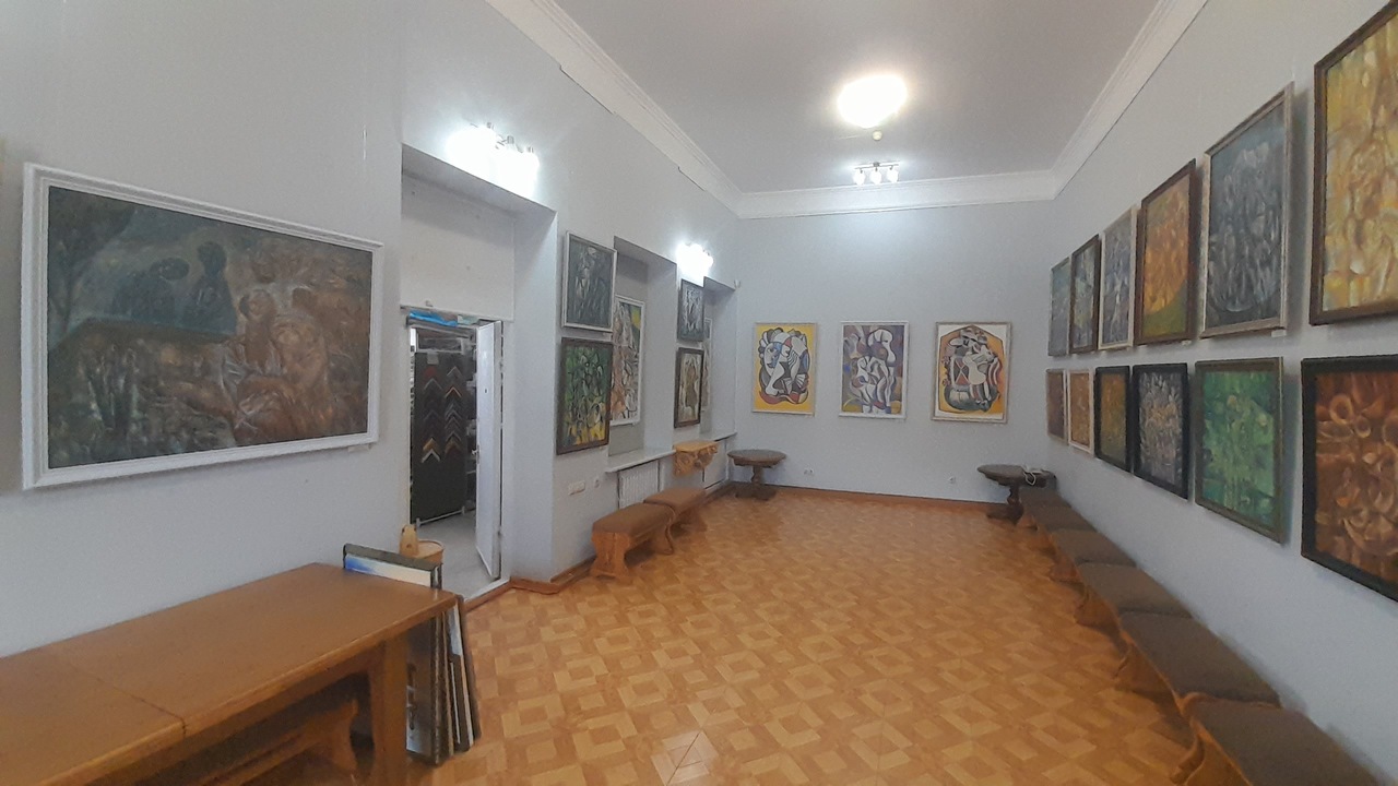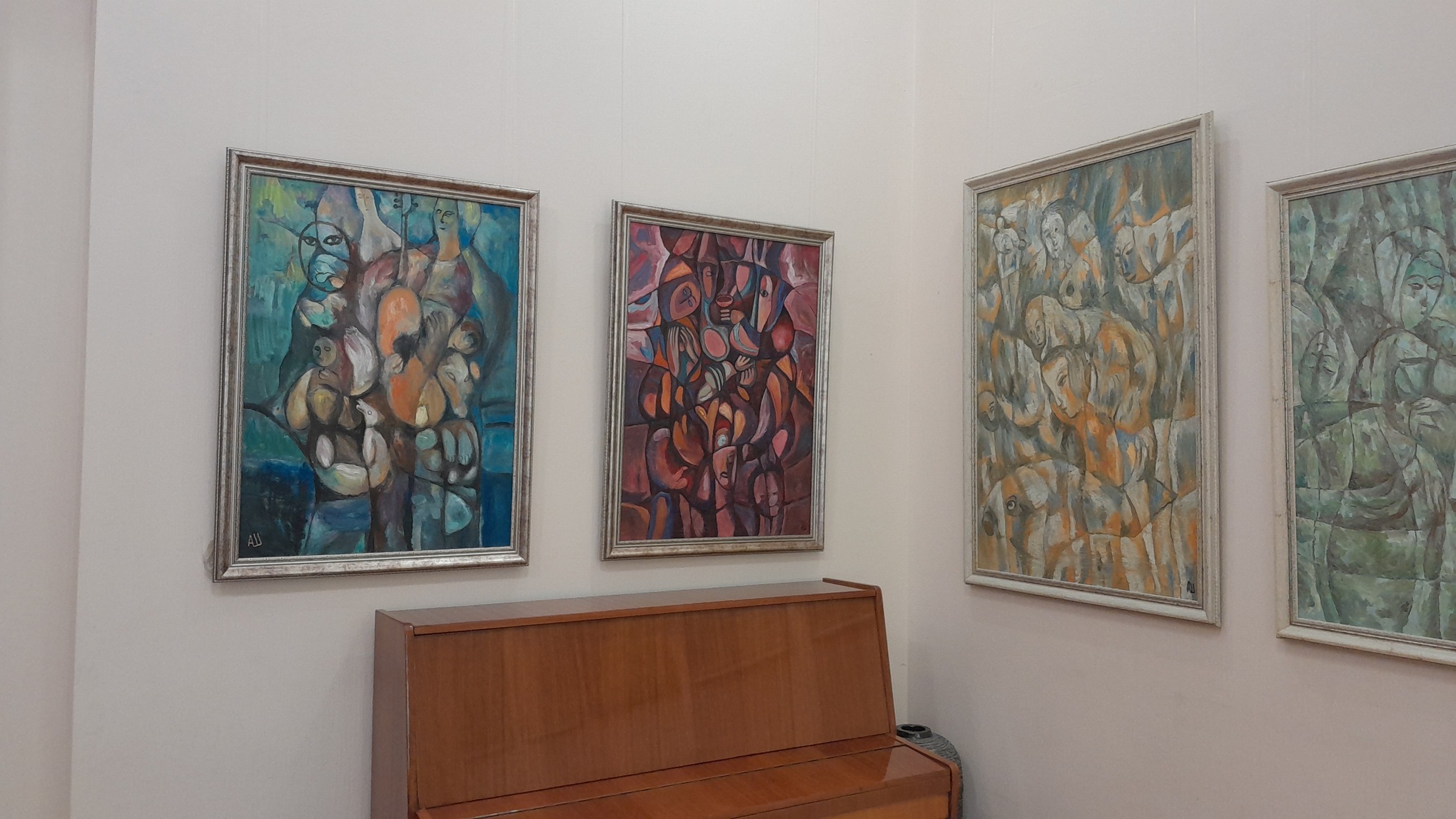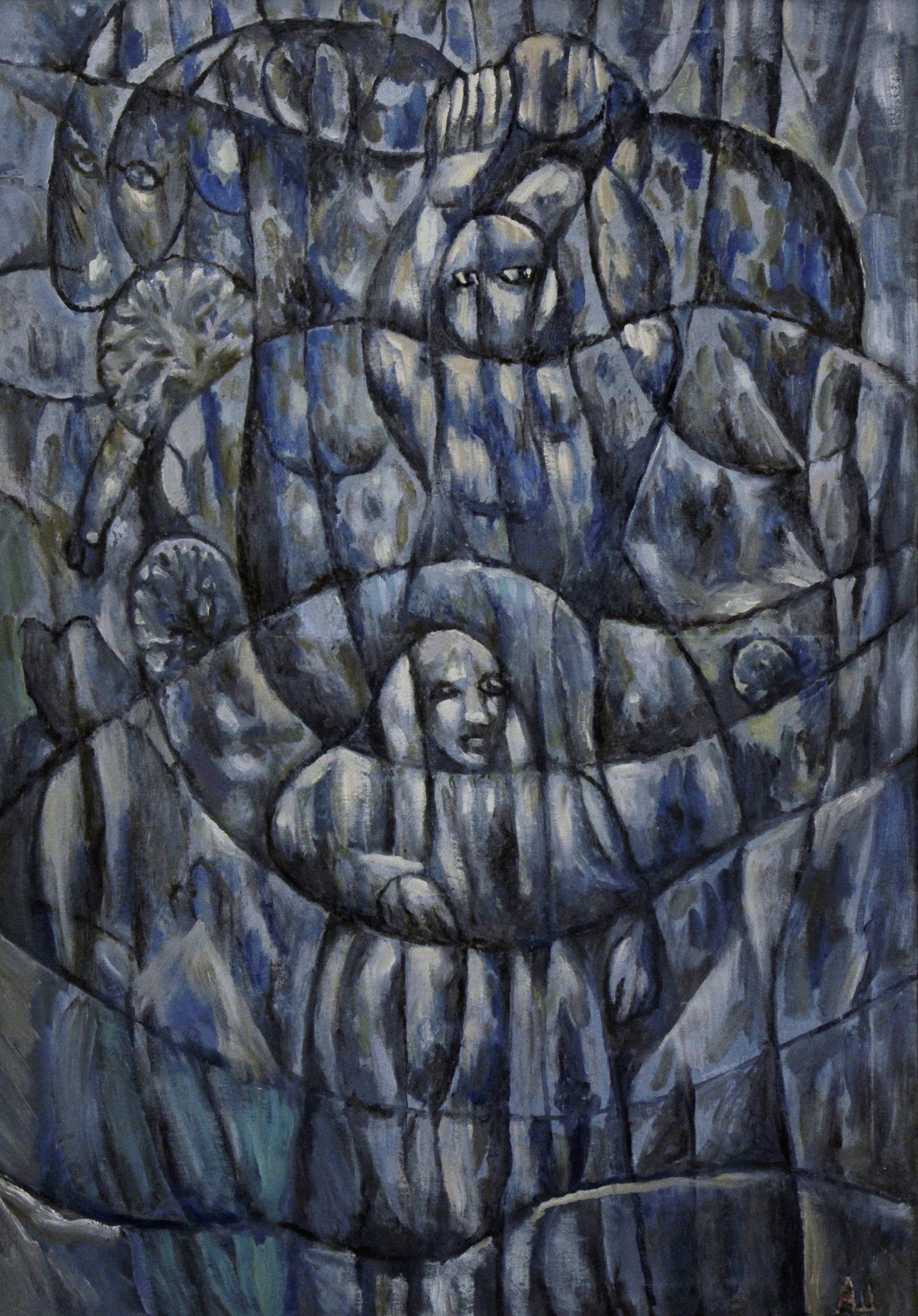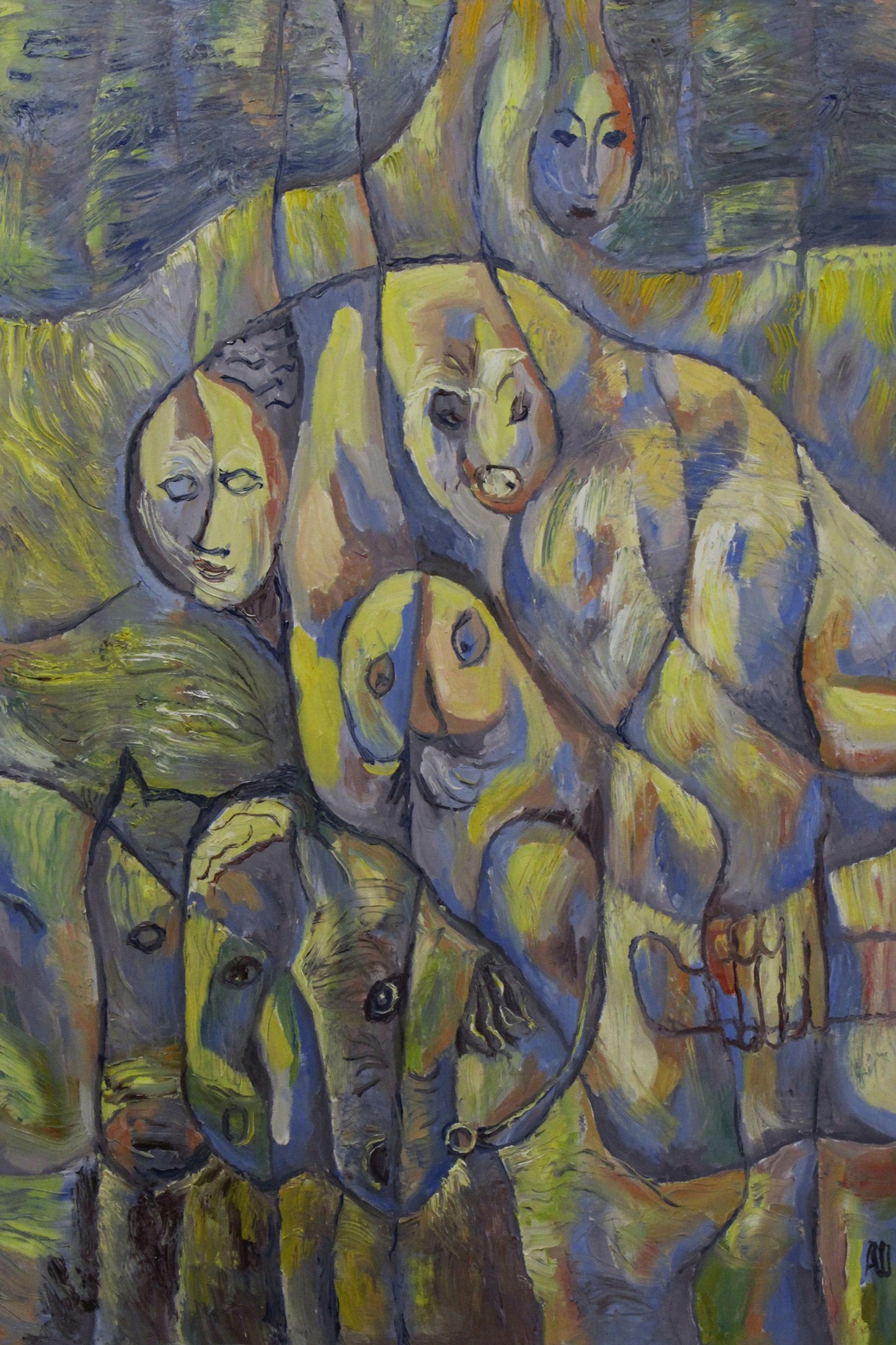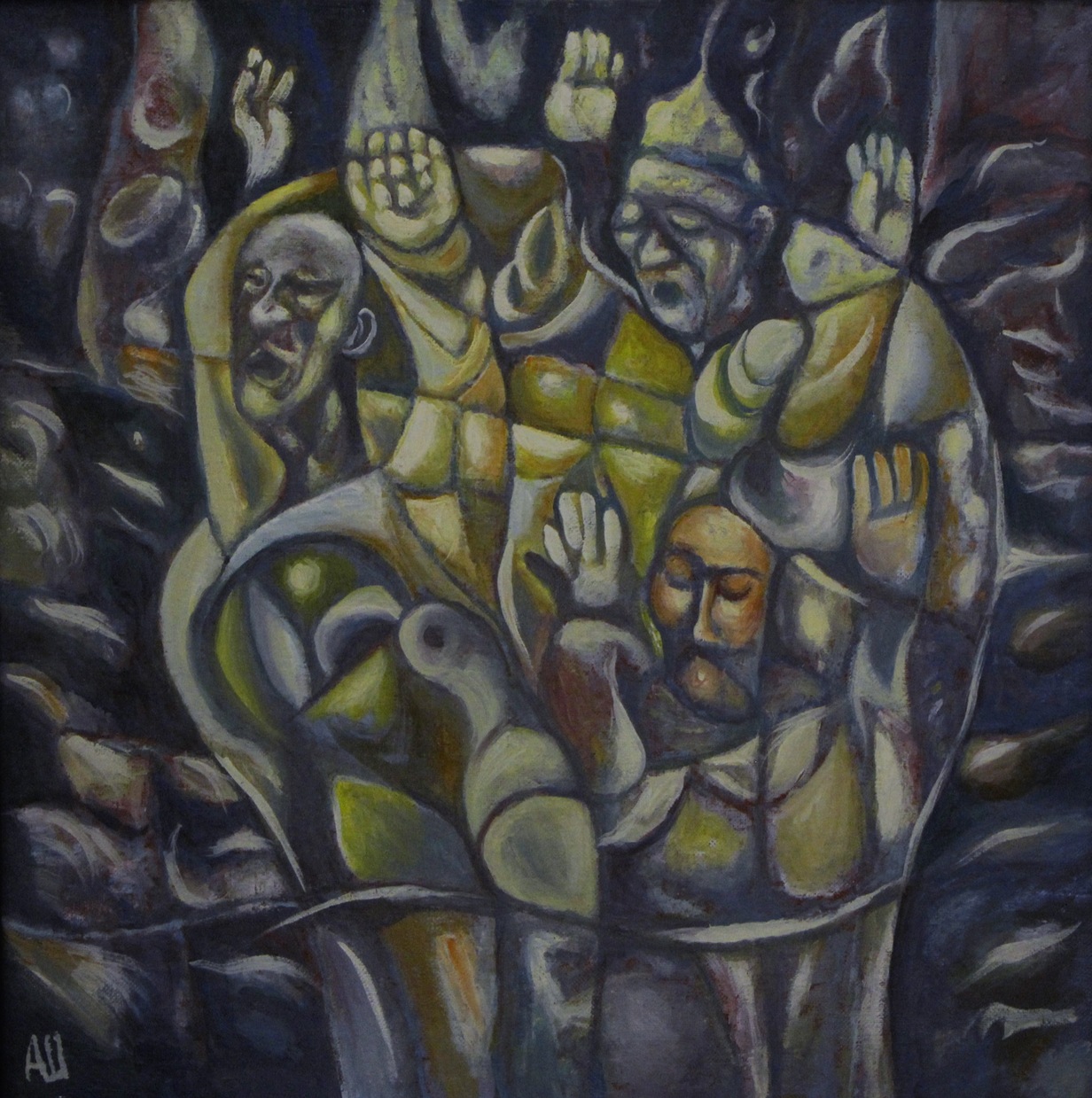 Картина «Сети» (2023.Холст, масло) – одно из характерных для амбивалентной эстетики художника. Она – наиболее неоднозначная для понимания. При первом восприятии кажется, что здесь главное – это юмор. Обнаженная женщина «поймала в сети» нескольких мужчин, протягивающих к ней руки с мольбой о спасении. Картина композиционно лишена глубины, все действо происходит на плоскости, что отсылает нас к стенной росписи или иконе. Женский образ на голубом фоне представляется таким своеобразным ангелом, тем более что крылья у него имеются. Какие души (изображенные внизу в оранжево-кровавом аду, рядом с фигурой адской нечисти) поймал этот ангел? Грешные или праведные? Эту мысль автор отдает на суд зрителя.