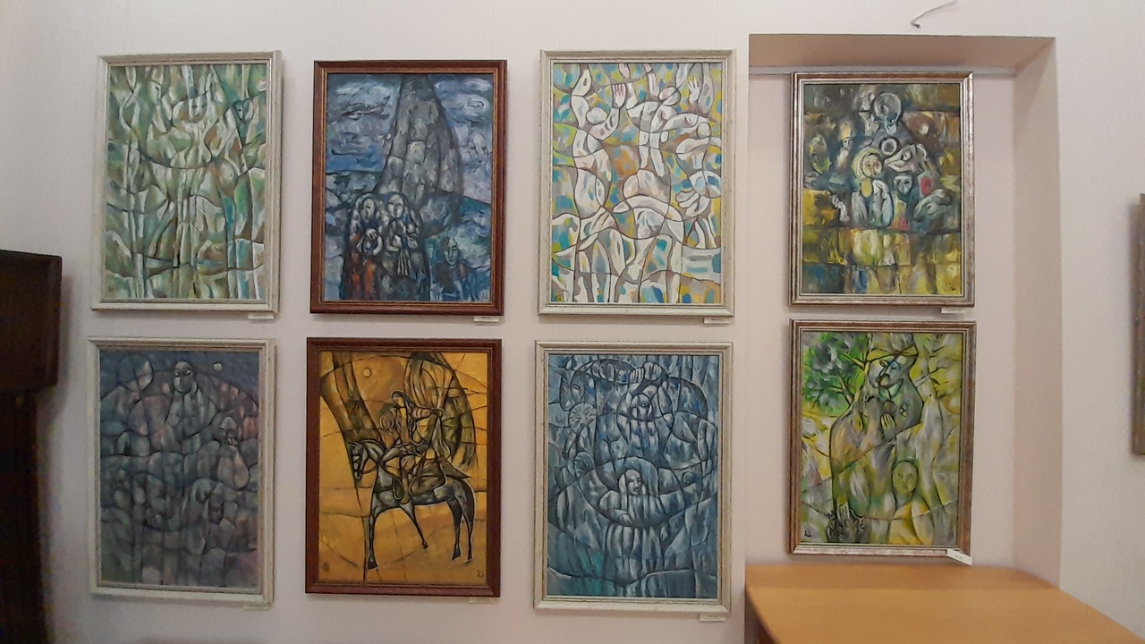 Все это было знакомо и близко. Читал Новый завет на русском, старался прочувствовать драматизм евангельских событий. Одна арка закончена, потом вторая. Линейно сделано. Одна линия от земли идет в крест. Художник импровизировал. Когда импровизируешь, искусство живое. Под куполом изображено Сотворение мира. В центральной арке – Богоматерь. В боковой - Распятие, Благовещенье, Святой Дух. Во время работы друг погиб. Одну из сцен (Крещение) посвятил ему. Встреча Девы Марии с воскресшим Христом – такой сцены не было никогда. По Евангелию Христа первой встречала Мария Магдалина. Ужин у Симона, встреча с Магдалиной. Она слезами вытирает ему ноги, плачет (почти как Сонечка Мармеладова). Симон говорит: