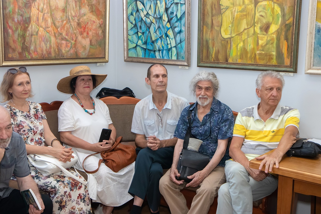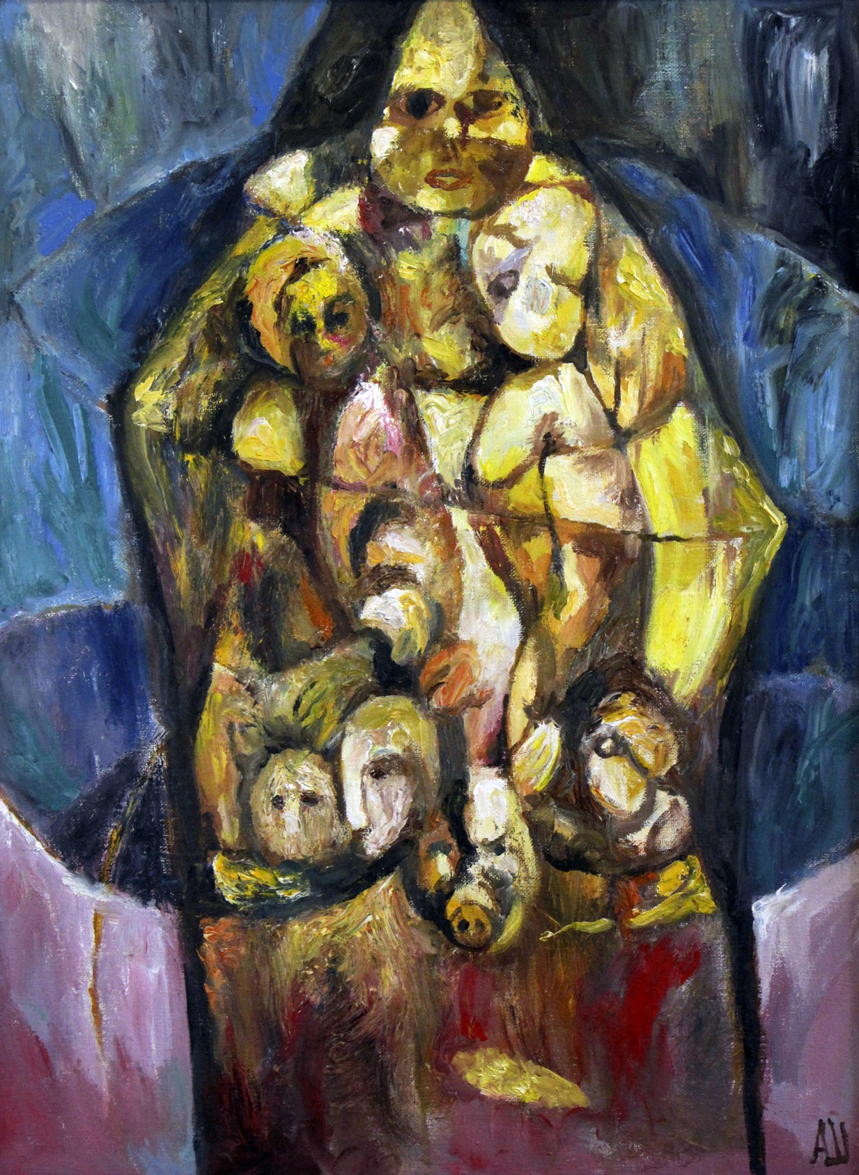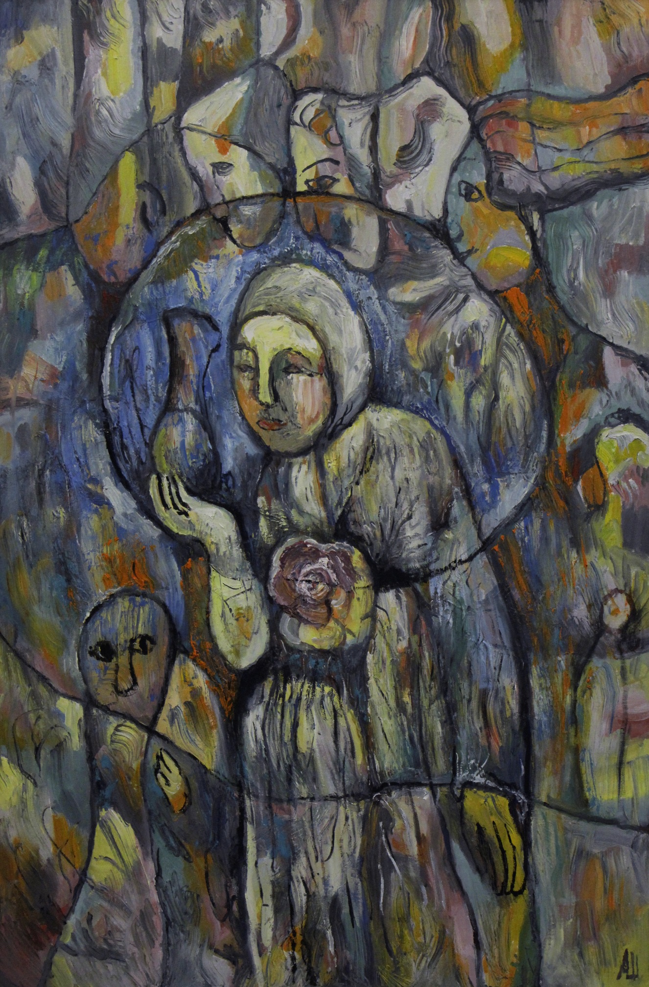 Александр Шевель мыслит на холсте, а не только создает чувственные, корпусные мазки, из которых возникает декоративный ковер с фигурами – тенями то ли забытых предков, то ли античных или библейских персонажей. Он использует прием далевого образа, возникшего еще в эпоху французского импрессионизма. Издали смотришь и видишь красоту цветных всполохов, подходишь близко и видишь, как персонажи медленно оживают и начинают сами вглядываться в глаза зрителей. А иногда образы стремятся раствориться в линиях и пятнах («Амазонки».2023. Холст, масло). Он часто использует христианскую символику, которую любили и символисты Серебряного века. Женские образы часто повторяют иконографию Богоматери («Материнство». 2023. Холст, масло), плоды земли и цветы трактуются условно, как вселенские знаки.